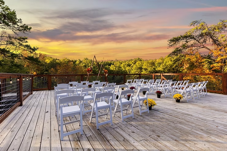 Our venue packages include some key items already built-in to help reduce planning overhead. Across their properties you’ll find features like 60 chairs, a decorative arch, and 6 tables in certain package levels. The venues come equipped with ceremony-ready spaces that include finished decks or designated outdoor ceremony sites with views. Lodging is offered but is not always included in every package, couples often purchase a venue-only rental or can upgrade to add the on-site lodging for guests.