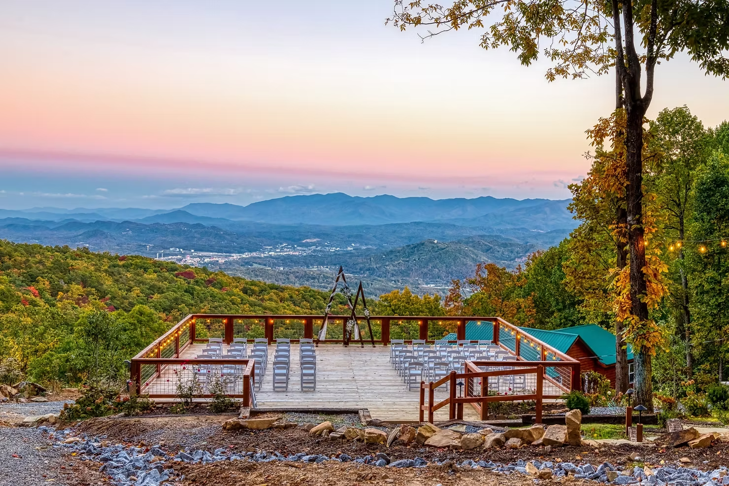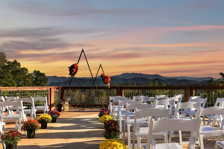 • Grand Sojourn Deck – Outdoor deck with panoramic Mount LeConte views, ideal for ceremonies or receptions up to 60 guests.