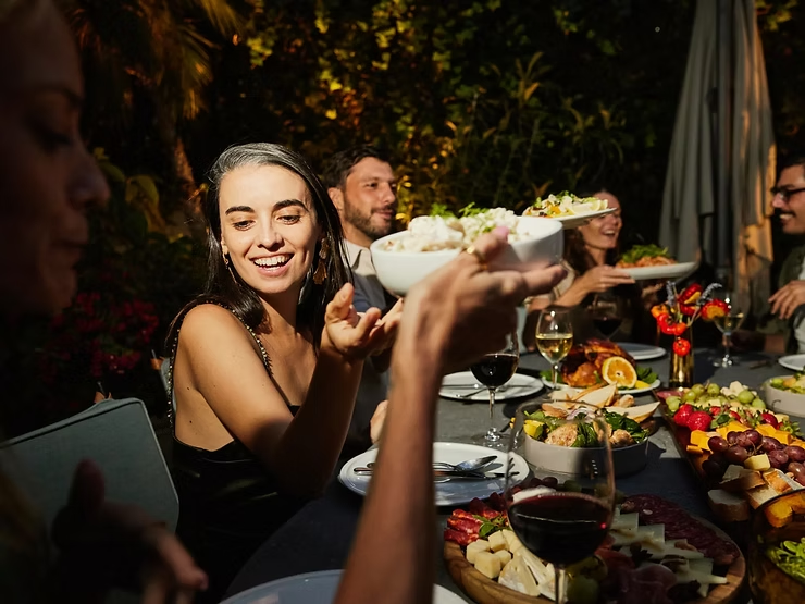 Pizza night or taco bar: Familiar, crowd-pleasing food that doesn’t feel formal. Self-serve stations encourage movement and organic conversation. No one feels awkward eating or choosing what they like.