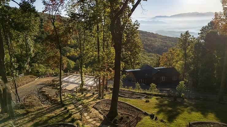 The Grand Sojourn is a tiny home venue designed for weddings that want convenience and community in one place. You can host up to 60 guests for the ceremony and reception, with overnight space for up to 80 guests across 40 on-site tiny homes. The property features a pickleball court, shuffleboard, scenic walking trail, firepits, and shared gathering areas, giving guests plenty to enjoy throughout the stay. With privacy, comfort, and beautiful Smoky Mountain surroundings, it’s a strong fit for couples who want everyone together in one location.