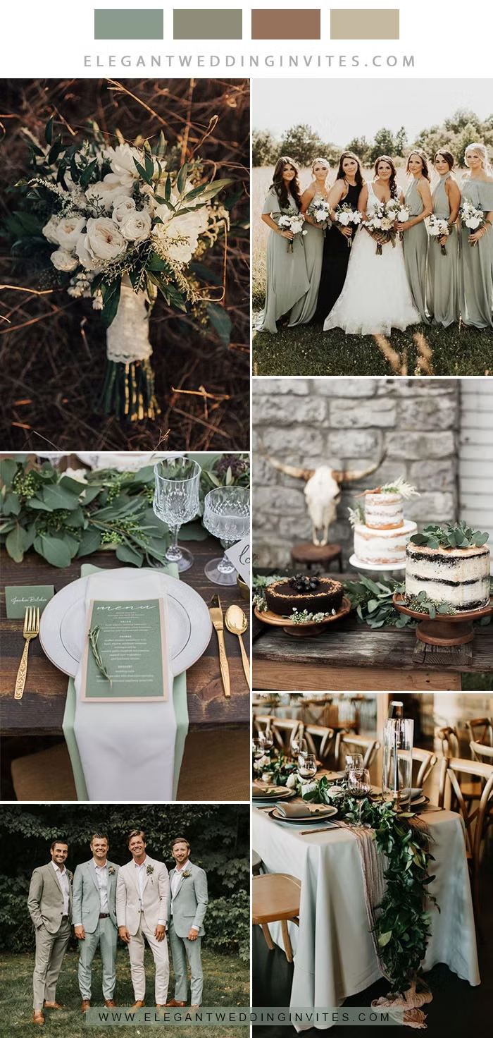 This color palette also works well across attire and stationery. Bridesmaid dresses in soft green tones photograph well in natural light, while neutral invitations with subtle green accents maintain a cohesive look from the planning stage through the wedding day. Overall, earthy greens and neutrals provide a versatile option for couples who want a fall wedding design that feels intentional, seasonally appropriate, and visually cohesive without appearing overly styled.