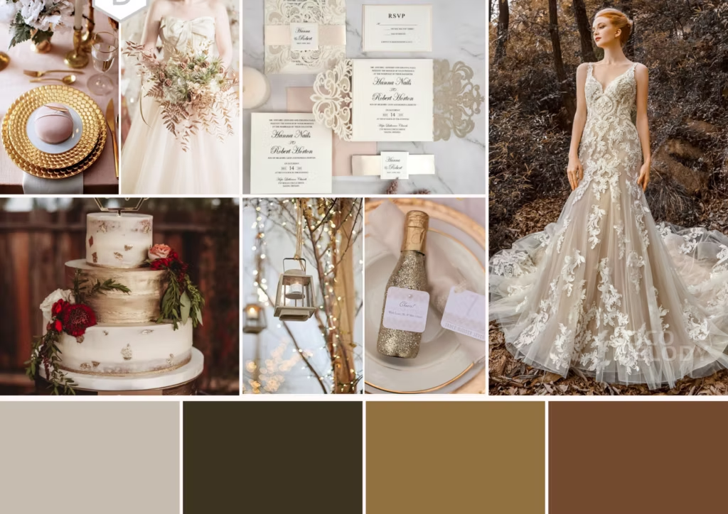 Warm neutrals and metallics also photograph well in both natural and artificial lighting, making them a practical option for evening receptions. Overall, this palette suits couples looking for a refined, contemporary fall wedding design that feels cohesive, polished, and seasonally appropriate without relying on traditional fall colors.