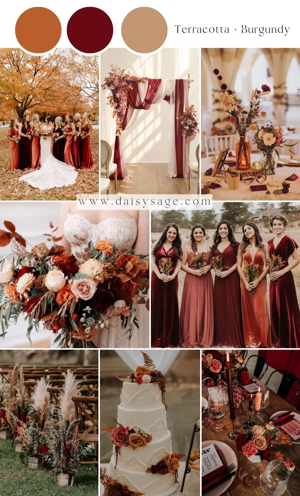 For the wedding party, attire is typically selected to align with the chosen palette and overall design direction. Bridesmaid dresses in colors like burgundy, forest green, rust, or muted jewel tones help carry the palette across the ceremony and reception. Fabric choice can also influence how these colors appear, as materials such as satin, chiffon, or velvet reflect light differently and affect the overall look.